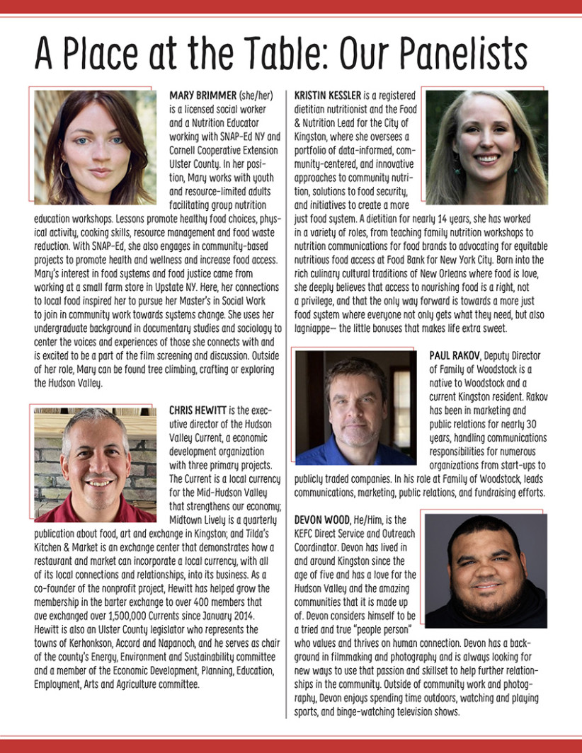 Stay after the film for a roundtable discussion with local experts and activists working in the field of hunger and food insecurity. Mary Brimmer is a Nutrition Educator working with SNAP-Ed NY and Cornell Cooperative Extension Ulster County. Chris Hewitt, is an Ulster County Legislator and the executive director of the Hudson Valley Current, a economic development organization with The Current (local currency for the Mid-Hudson Valley that strengthens our economy; Midtown Lively is a quarterly publication about food, art and exchange in Kingston; and Tilda’s Kitchen & Market). Devon Wood is the Direct Service and Outreach CoordinatorKingston Emergency Food Collaborative. Kristin Kessler is the Food & Nutrition Lead for the City of Kingston, where she oversees a portfolio of data-informed, community-centered, and innovative approaches to community nutrition, solutions to food security, and initiatives to create a more just food system.